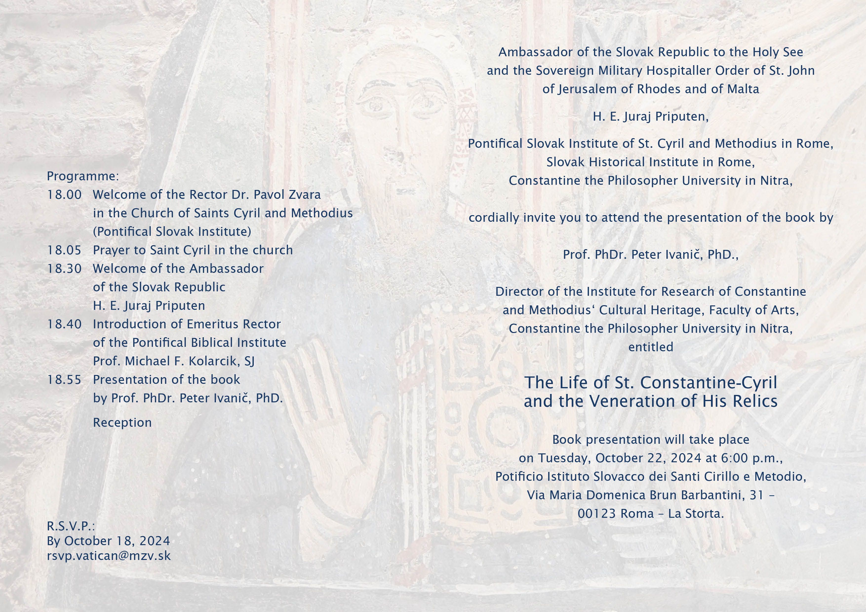 Slovenský historický ústav v Ríme Vás srdečne pozýva na prezentáciu knihy prof. Petra Ivaniča Život sv. Konštantína-Cyrila a úcta k jeho relikviám, ktorá sa uskutoční na pôde Pápežského slovenského ústavu sv. Cyrila a Metoda v Ríme 22. októbra 2024 o 18.00. Podrobný program nájdete v priloženej pozvánke.