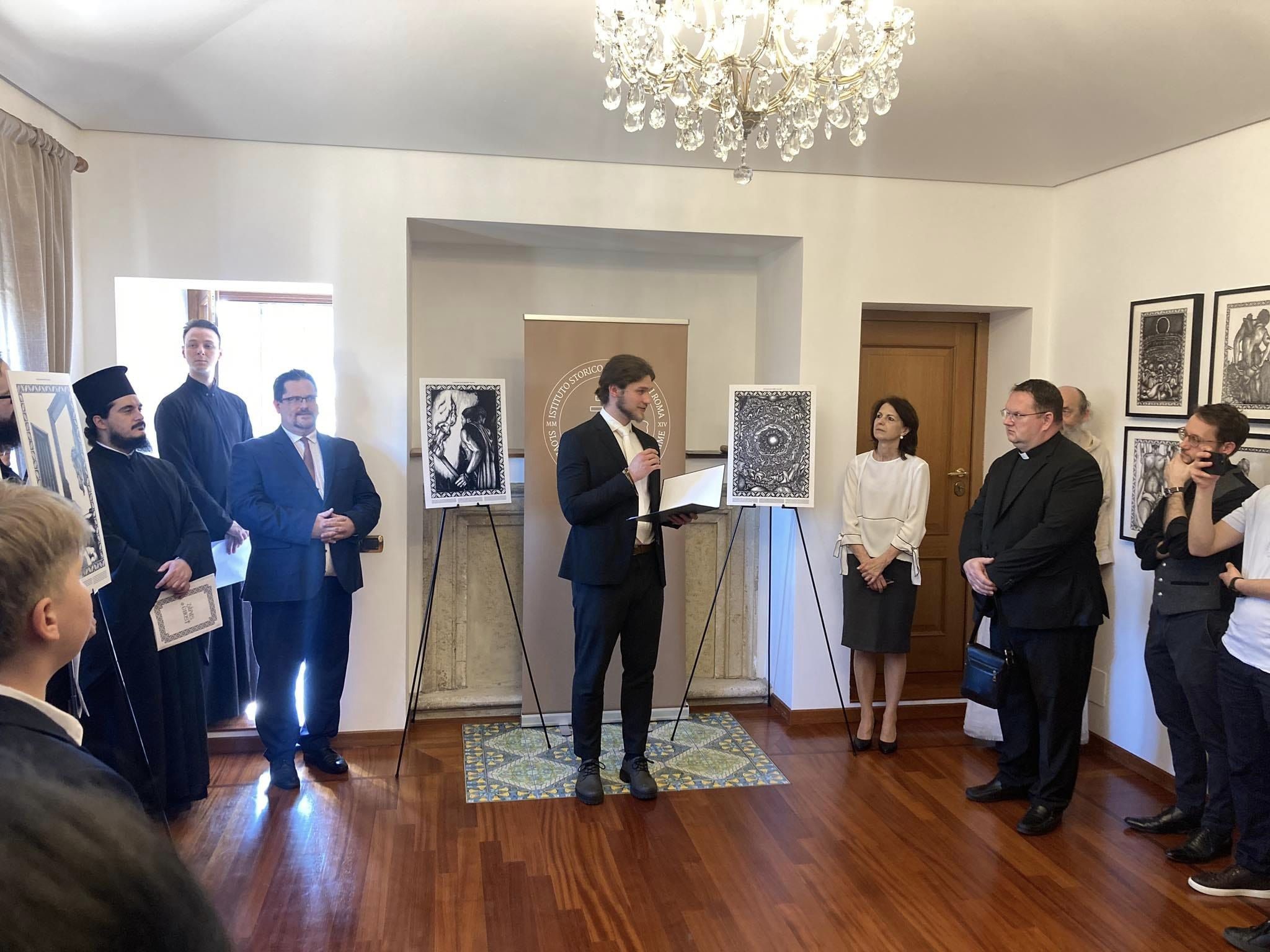 V nedeľu 14. apríla 2024 sa v rímskych priestoroch Slovenského historického ústavu v Ríme uskutočnila vernisáž výstavy Zápas o cnosť, ktorej autorom je Samuel Rinik, mladý slovenský umelec momentálne študujúci a pôsobiaci v Ríme.